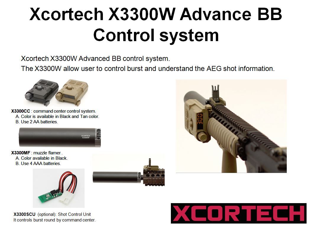 Xcortech X3300W Advanced BB Control System is a 3 piece set that comes in either Black or Tan. It comes with a PEQ command box, a BB tracer unit and a Burst ECU Mosfet system.